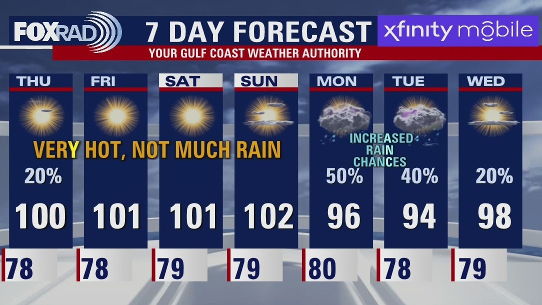 Houston may see an isolated shower on Thursday, but don't count on much rain around Southeast Texas until Monday. A summer cold front will break the hot and dry pattern. At least for a couple days.