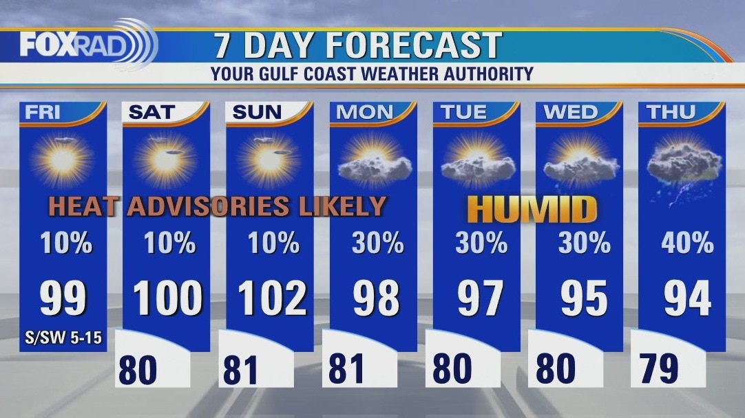 Sunny, sultry day Friday with highs in the upper 90s and feels like values 100+