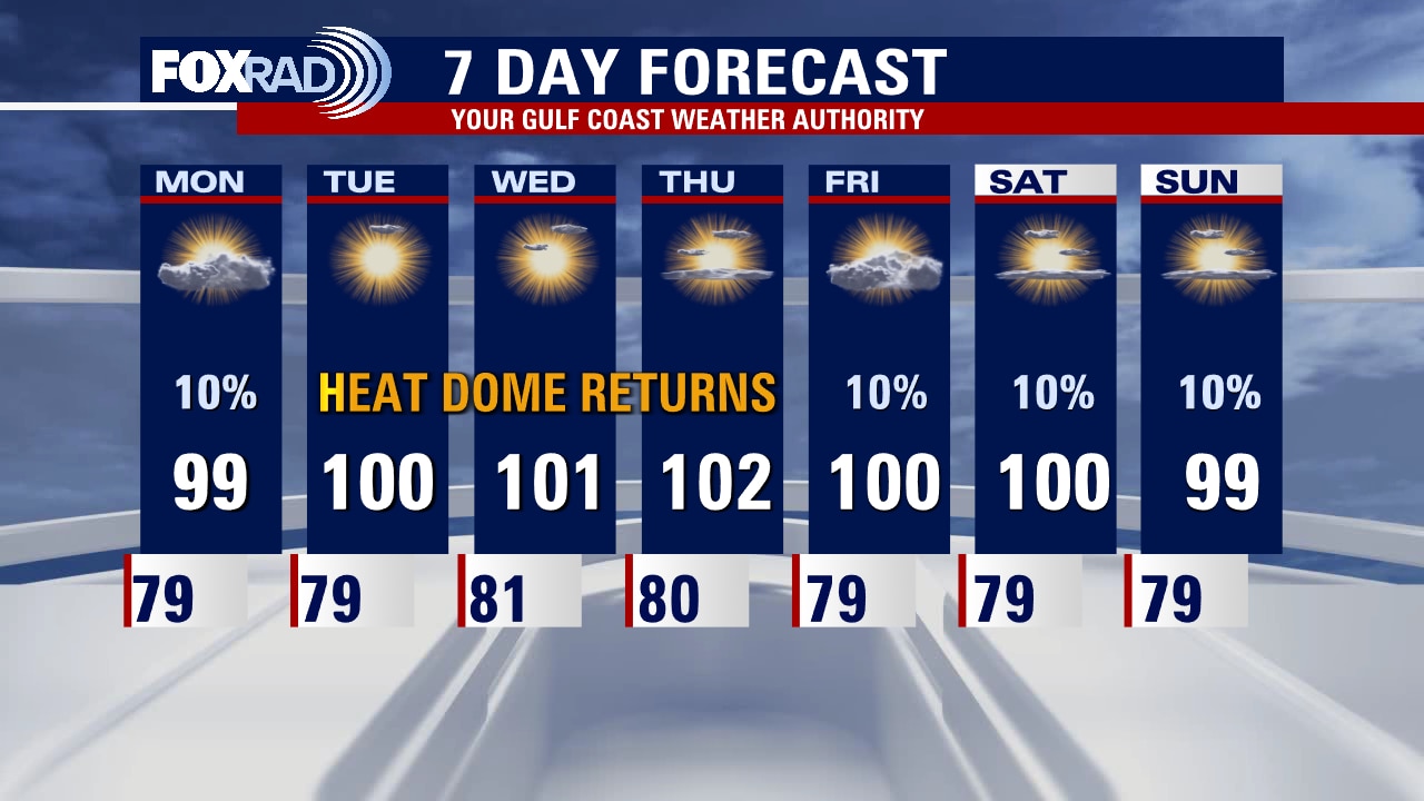 If you noticed milky, hazy skies over the weekend it was thanks to a plume of Saharan dust that has been keeping the Tropical Atlantic very quiet. That should mix out as high pressure continues to build and dominate not only our weather pattern, but the majority of the country is also bracing for above average temps. Be on the lookout for several more 100+ degree days, with heat advisories likely throughout the week. Sunshine will be the dominant weather factor, but we'll also be fairly breezy this week which is good news for wind power and the grid. As for rain? Only the lucky ones will squeak out a very isolated shower or storm this week. However, rain chances might get a boost closer to the weekend as a trough advances west through the Gulf. Fingers crossed!