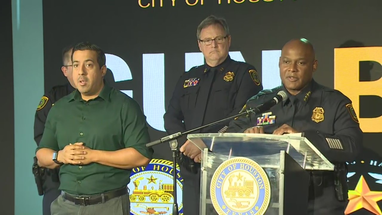 Houston Police Chief Troy Finner and Harris County Precinct 1 Commissioner Rodney Ellis discuss the gun buyback event in Houston on July 30.