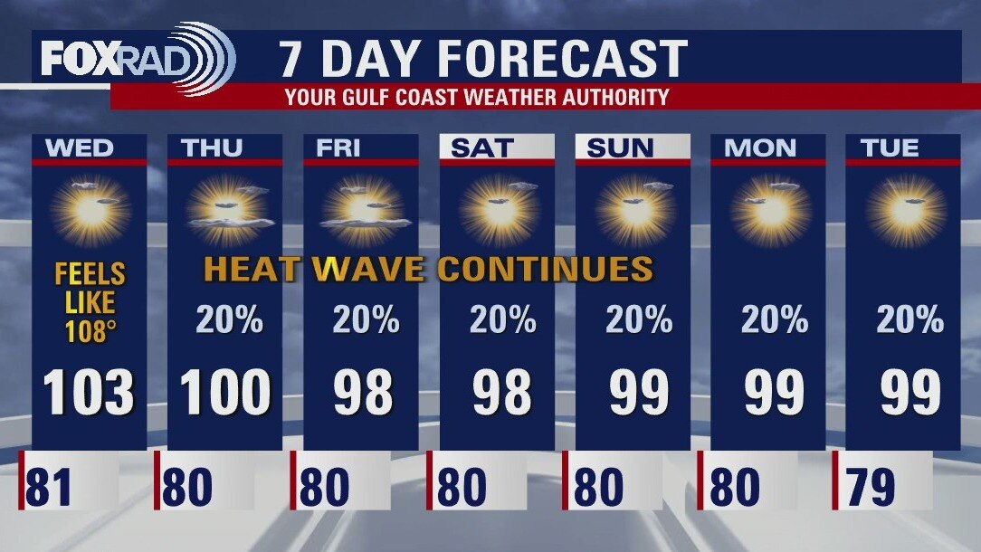 Extreme heat continues across Southeast Texas and should be around for several more days. The Northwest Counties in the FOX26 area will be under an Excessive Heat Warning for Wednesday and the rest of the area under a Heat Advisory. Use caution with any strenuous activities outdoors. There will be low chances for isolated rain as we move towards the end of the week.