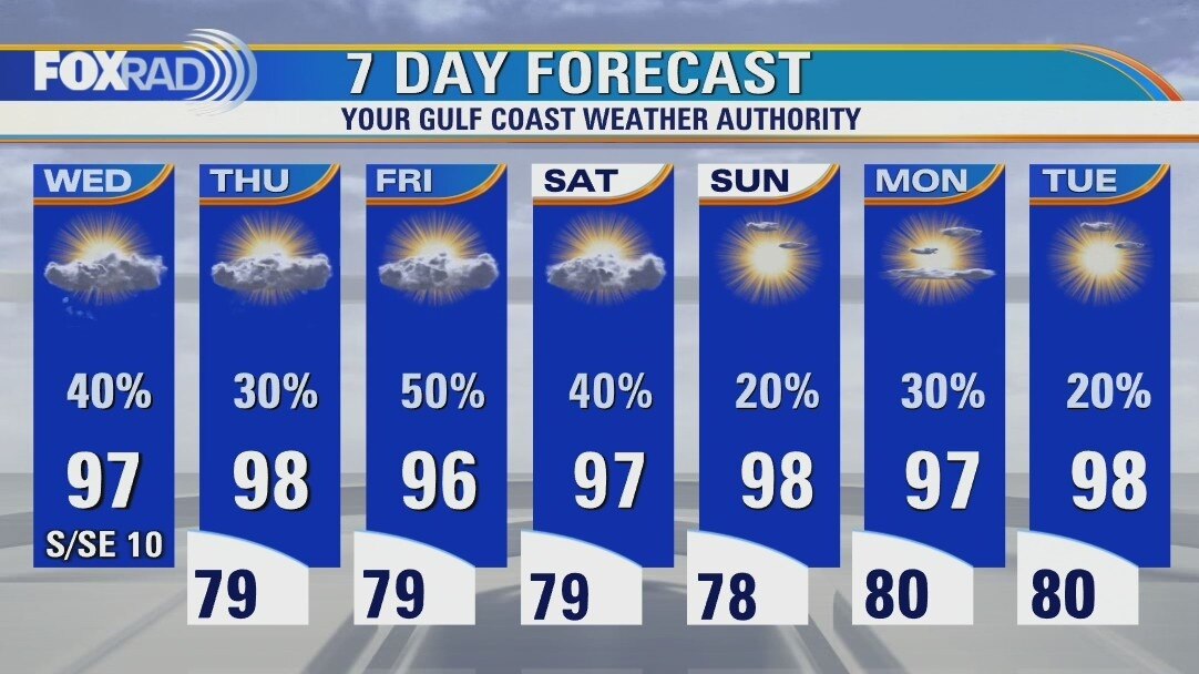 Isolated Wednesday morning showers, then hot with scattered late day storms