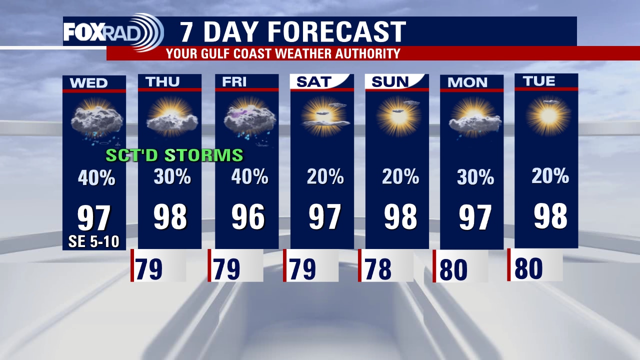The extended forecast features no triple digits and decent shots at rain -- with our best bet being today. Plan for scattered showers and storms to be around through the end of the work week, with a plume of Saharan dust trending us drier for the weekend. We look to stay below heat advisory criteria for the next week, though feels like values will still be above 100. The Tropical Atlantic remains very quiet, as the drought worsens across the state.