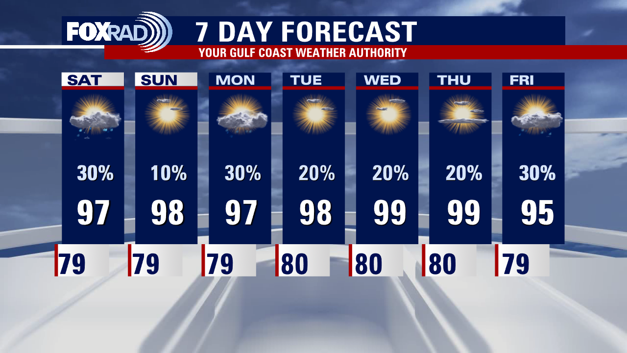 Temperatures will be trending a touch hotter this weekend, with highs climbing into the upper 90s and feels like temperatures soaring into the 102-107 range. A few isolated showers and thunderstorms will be possible but the coverage looks to be very spotty both Saturday and Sunday. Daily scattered storm chances continue into next week with temperatures staying toasty.