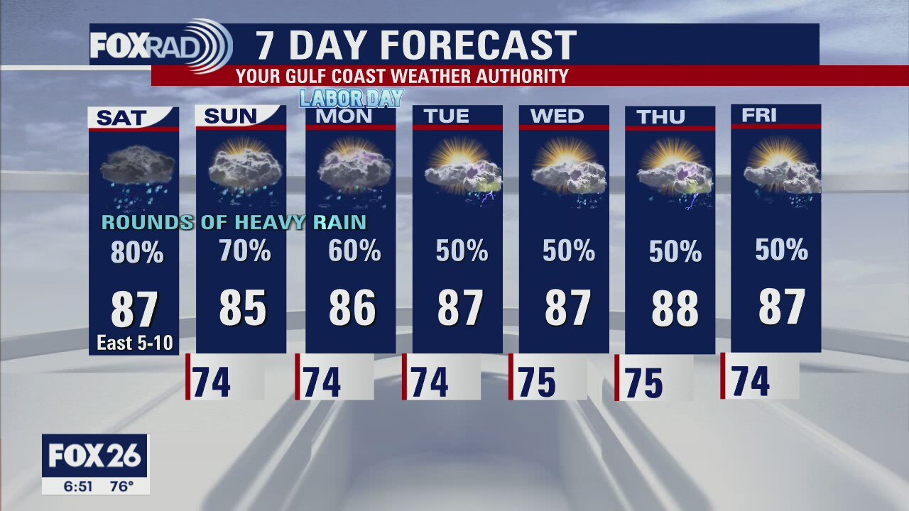While the bulk of the heavy downpours were concentrated mostly north yesterday, today our entire area has equal odds at rounds of heavy rain. As a slow moving stationary boundary continues to progress toward the coast, Sunday's heavy rain potential looks to follow suit. It won't be raining all the time, but it may come down relentlessly when it does so plan for some minor street flooding throughout the weekend. Eventually, all the available moisture will get used up and rain will wane back to daily afternoon showers and storms through much of next week.