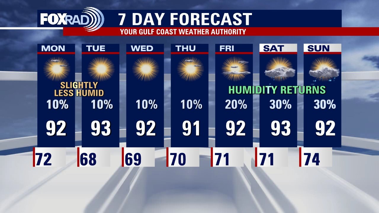 Monday and Tuesday morning will feel a bit different across southeast Texas with slightly drier air in place behind a week cold front that arrived to Houston Sunday. Most of the week will feel pleasant with some mornings in the upper 60s. Afternoons will be warm with afternoon highs in the lower 90s. Rain chances remain low until next weekend.