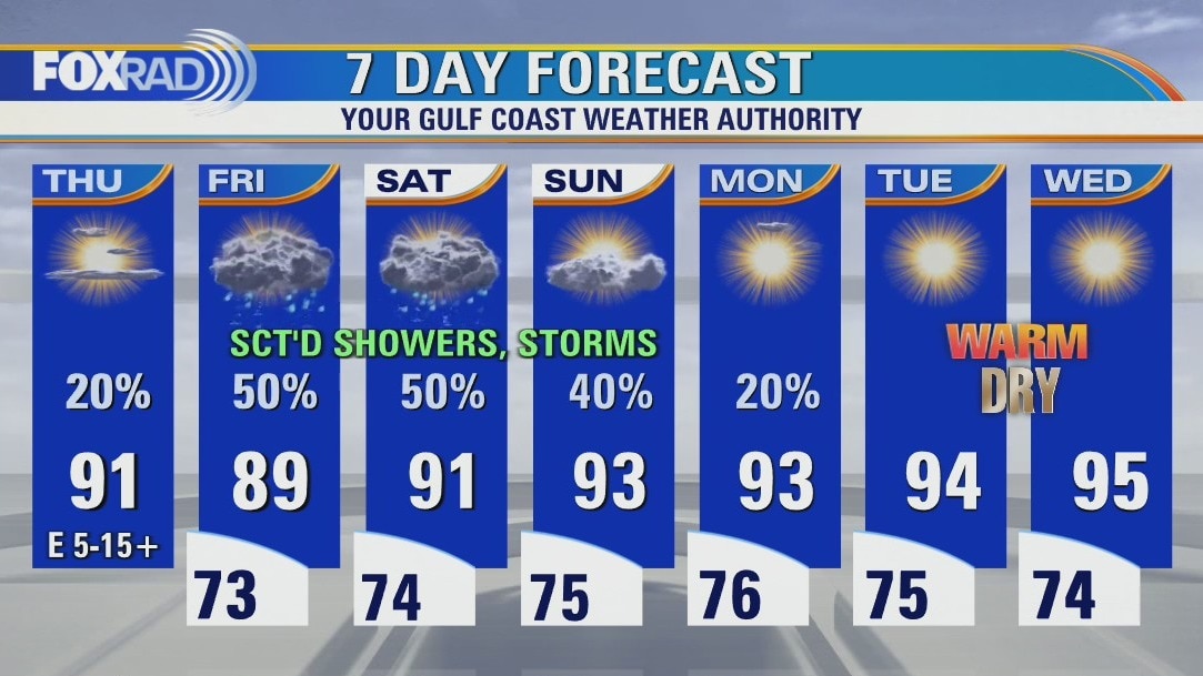 Hopefully, you enjoyed the low(er) humidity because here comes the moisture! Breezes out of the east, eventually turning southerly will bring a noticeable increase in humidity as we close out the week. Along with that, rain chances will also be on the rise. It won't be a washout, but a few downpours and thunderstorms will also be in the mix over the weekend. Heading into next week, we dry out and warm up. In the tropics, our 6th named storm of the season has formed. Tropical Storm Fiona, however, is not expected to impact the Gulf.