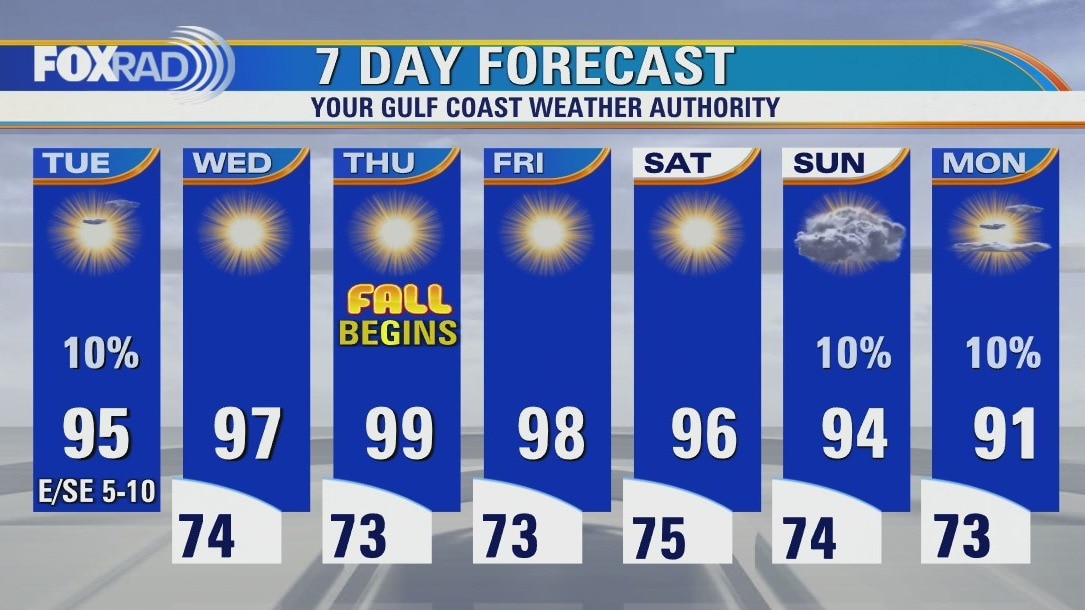 As Hurricane Fiona slams the Turks and Caicos Islands this morning, our weather is looking sunny, hot and mostly rain free. In fact, the first day of fall on Thursday could be the hottest day of the week with highs in the upper 90s. The record high is 100. In the longer term, we'll keep our fingers crossed for a cold front which is possible early next week and a developing tropical disturbance moving into the Caribbean.