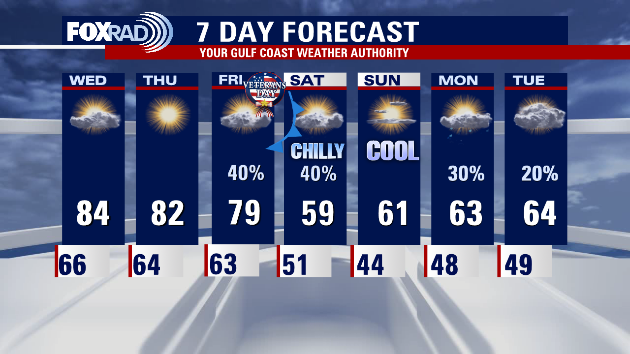 Our temperatures will be dipping to the middle to upper 60s early Wednesday. We remain warm and dry the next few days with rain returning with a cold front Friday PM. Rain lingers early Saturday but no severe weather is expected with this system. However, a big surge of chilly air arrives just in time for your weekend plans so prepare now!