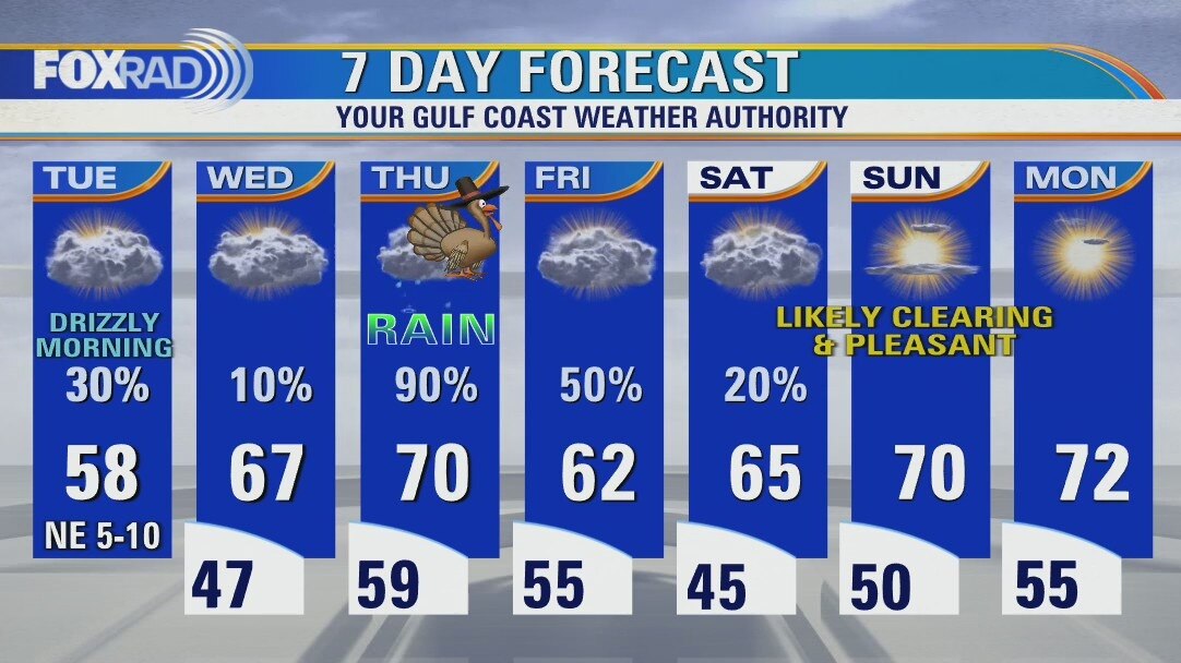 The outlook for Thanksgiving still looks stormy with highs near 70 and even a slight chance for a strong or severe storm. Today brings more morning showers and hope for a peek of afternoon sun. Enjoy a brief day of decent weather tomorrow before the holiday rain. Showers could linger through the first half for Friday, but Saturday and Sunday are finally looking great!