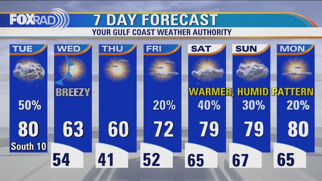 This week is a bit of a weather roller-coaster with this morning's temperatures running 25 degrees warmer than Monday's. This additional warm, humid air will bring scattered showers and some afternoon storms with a few strong ones mainly east of Houston. Today is expected to be particularly dangerous across Louisiana and Mississippi with a risk for tornadoes. Tomorrow morning a cold front will bring cooler and drier north winds followed by a chilly Thursday morning. A warming trend takes us into the weekend.