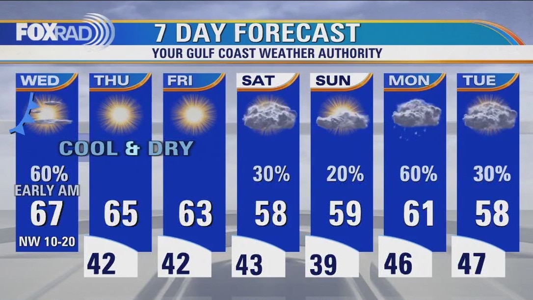After early morning rain, a cold front will bring clear, very dry and cooler weather. Look for afternoon sun with breezy northwest winds today. Lows over the next several nights will drop to the upper 30s and low 40s with highs in the mid 60s. The pattern through Christmas still looks cold.