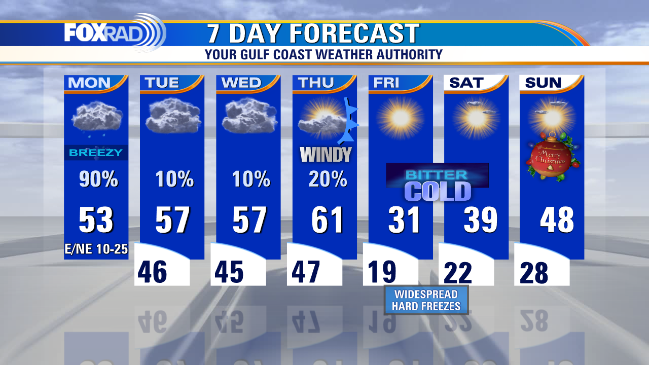 Not the best start to the week as a coastal low brings rainy, chilly, breezy conditions. But, today will feel like paradise compared to the end of the week. Tuesday and Wednesday will be cloudy, cool but mostly dry for Christmas and 4 P's prep. Thursday will be a bit of a wild ride, as depending on the timing of the front the coast could near 70 while inland locations get stuck in the 50s. Gusty winds will rapidly drive down temps wind chills and could cause isolated power outages. As a Christmas present, we should finally get above 40 by Sunday.