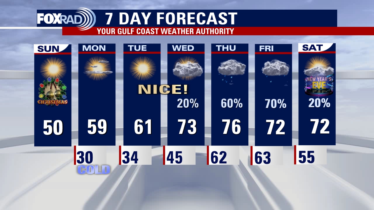 After another hard freeze on Christmas morning, we will remain chilly for the next few days, but you'll notice a prolonged warming trend. Look for more cold mornings, but milder days with a high near 50 today, then closer to 60 on Monday. We could hit the mid-70s later this week, but rain will also return with high chances on both Thursday and Friday.