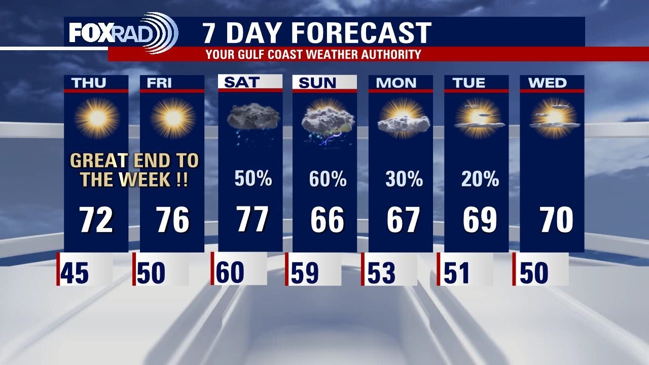 The great weather continues for Southeast Texas to finish out the work week. Expect a breezy Friday as the next Pacific storm system moves across the country, eventually increasing rain chances for Houston over the weekend. Don't look for a complete washout of a weekend but there will be some showers and isolated storms to dodge.