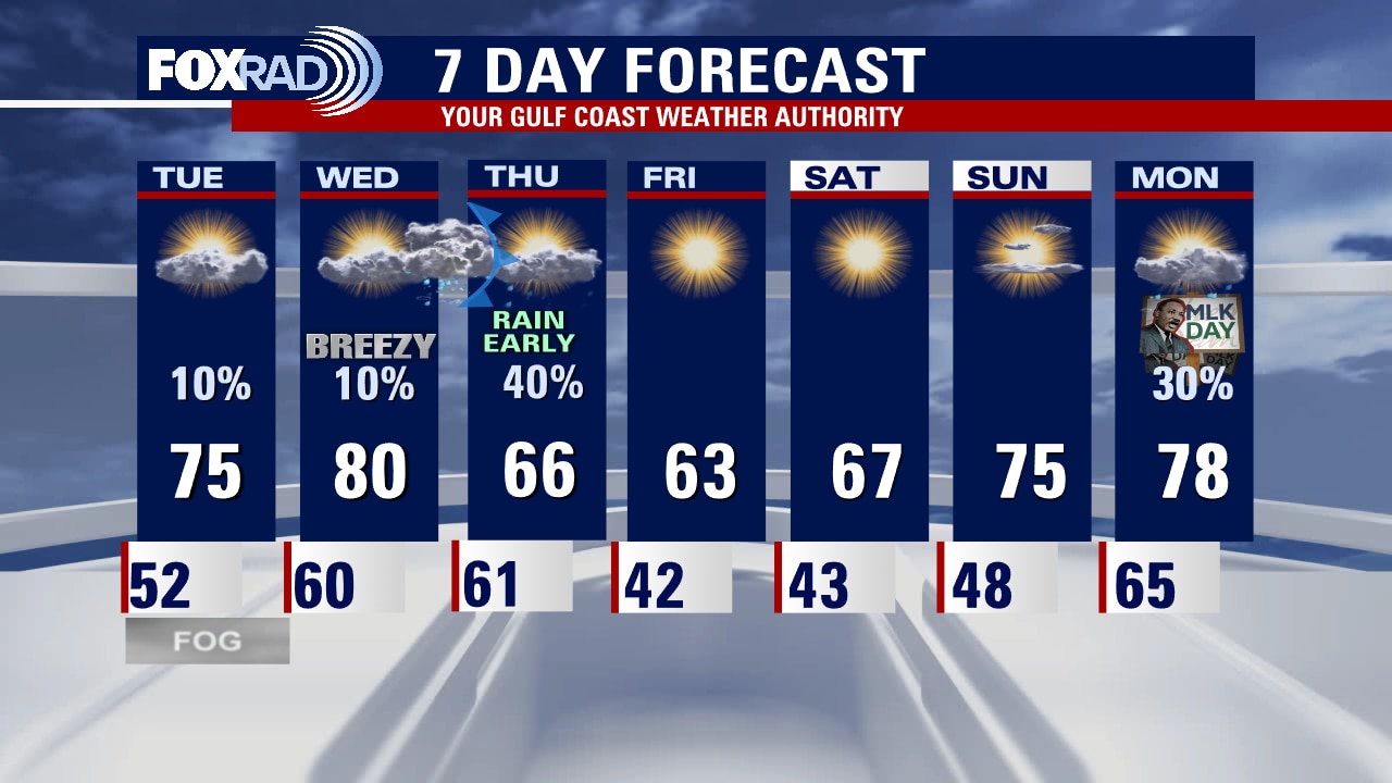 After a soggy weekend, it's been a beautiful start to the work week although a tiny bit cooler. Look for light jacket weather to prevail tonight with lows in the 50s for most areas. Big-time heat returns over the next few days with high temperatures near 80 Wednesday which will be flirting with records again. Our one decent shot for rain this week comes Wednesday night into early Thursday with our next cold front. A few strong storms may accompany the front with the best shot north of Houston up towards Huntsville. After that, we dry out through the weekend with mild temperatures expected.