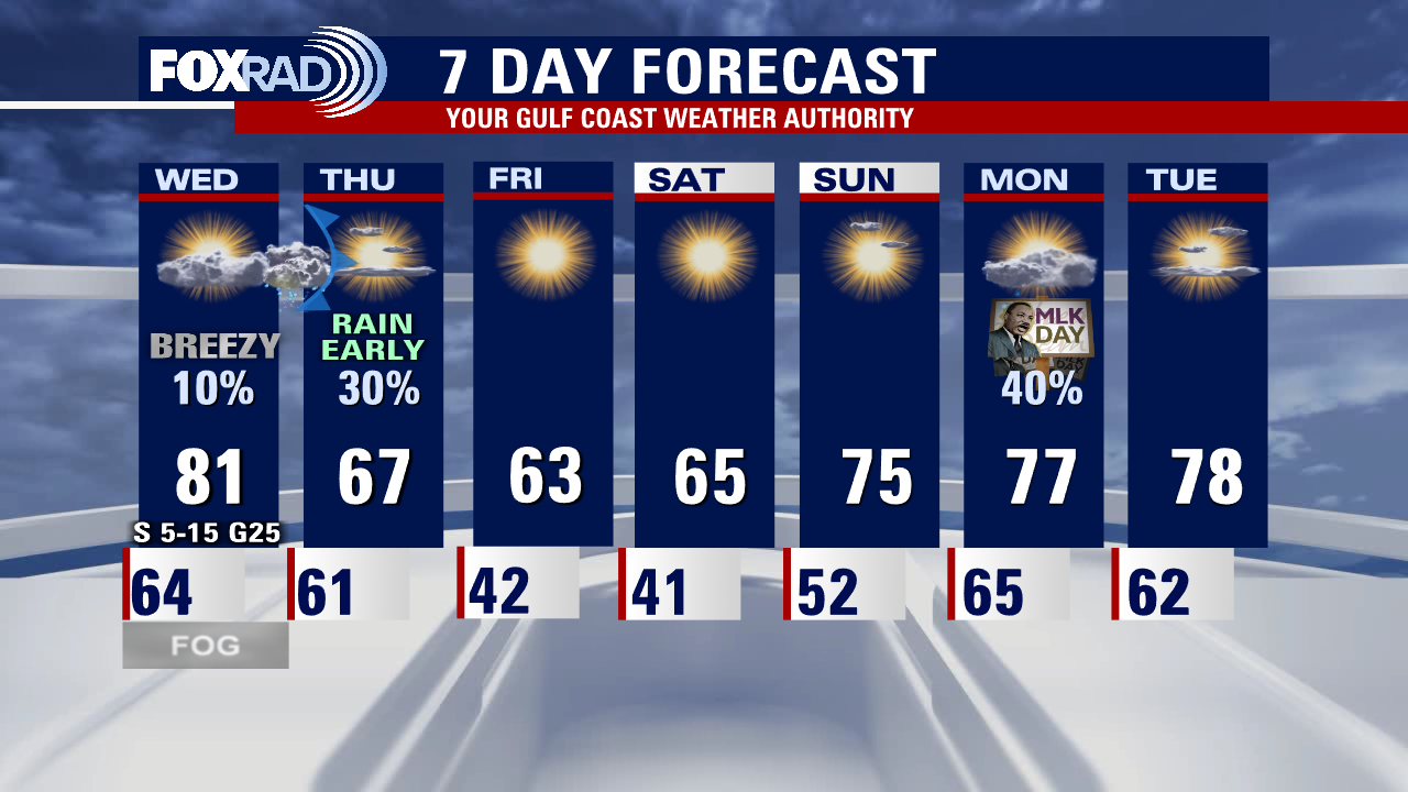 It's been another beautiful January day after a foggy start. Look for more low clouds and fog to develop late tonight, especially near the coast. Fog is not expected to be as thick or widespread as this morning though. Near record-high temperatures near 80 are on the way for Wednesday with breezy weather. A cold front will push through early Thursday morning bringing widely scattered showers and possibly a few storms. The good news is that the severe storm threat should remain out of our area.