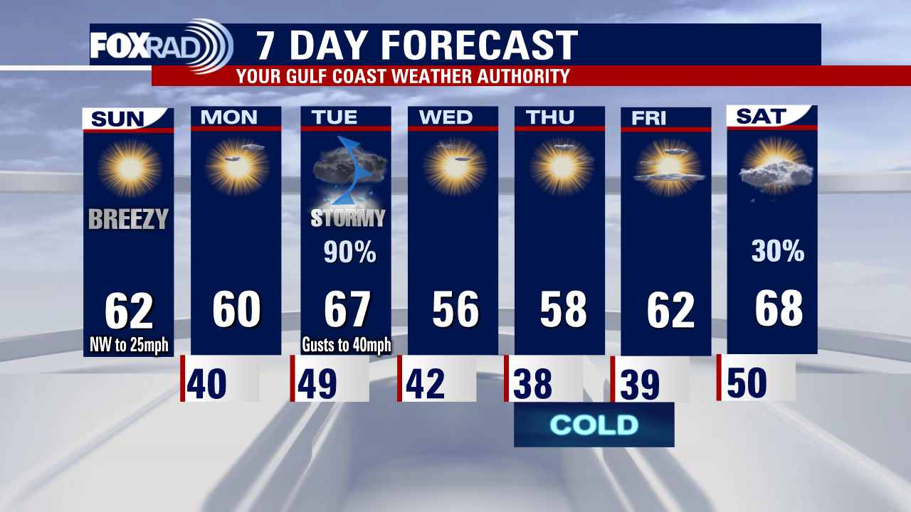 Aside from the breeze, today will be a pleasant January day with sunshine continuing tomorrow. Tuesday is really our only problematic day of the week, with strong to severe storm potential and locally heavy rainfall likely. Look for a few cold starts toward the end of the week post-front, with inland locations likely closer to freezing. Southerly winds take over again by the weekend, increasing temps, humidity and rain chances.