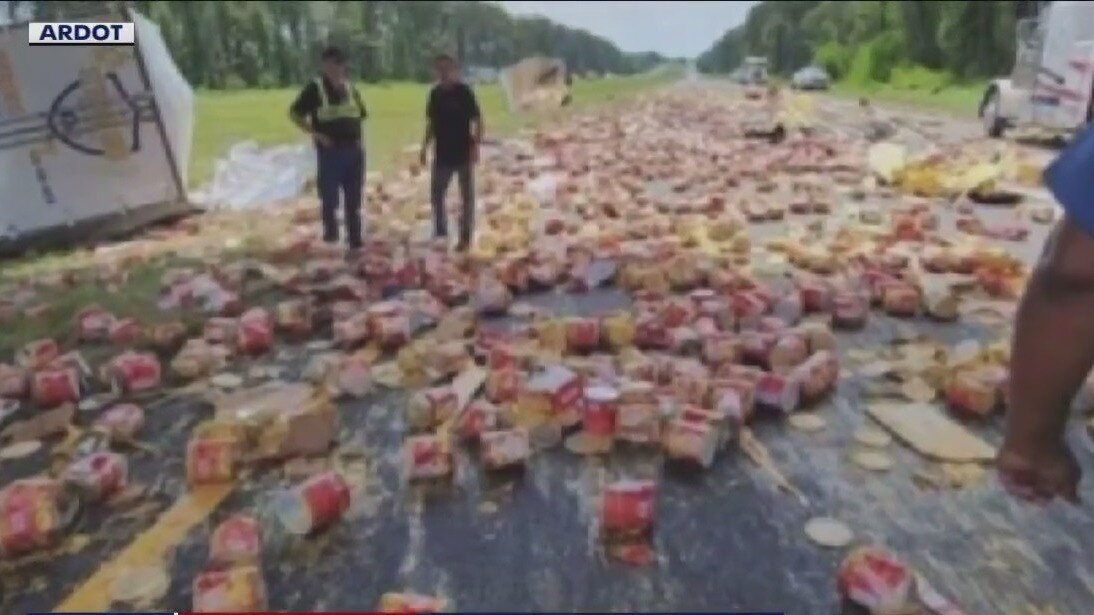 Clean up on I-30! Nacho cheese sauce made a mess in Arkansas on Tuesday after a truck carrying cans of cheese spilled its contents on Interstate 30 in the southwest part of the state.