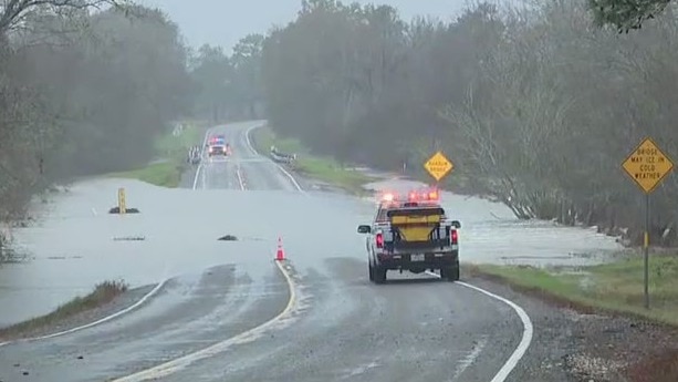 Fox 26 reporter Shelby Rose is near the county line between Grimes and Montgomery County, where a flood gauge reveals over two feet of water to the left of the road.