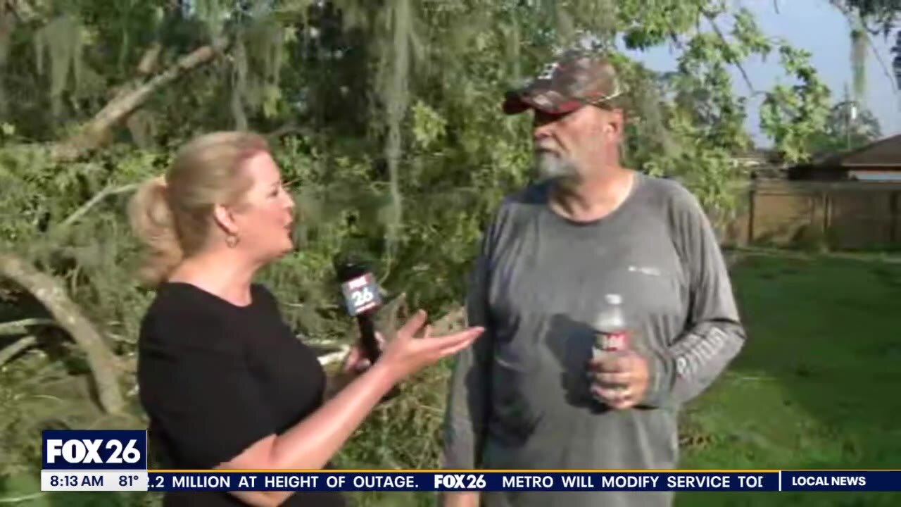 Heather Sullivan talks to local Houstonian about trees falling into his yard after Beryl and finding tree trimmer crews with no cell service.