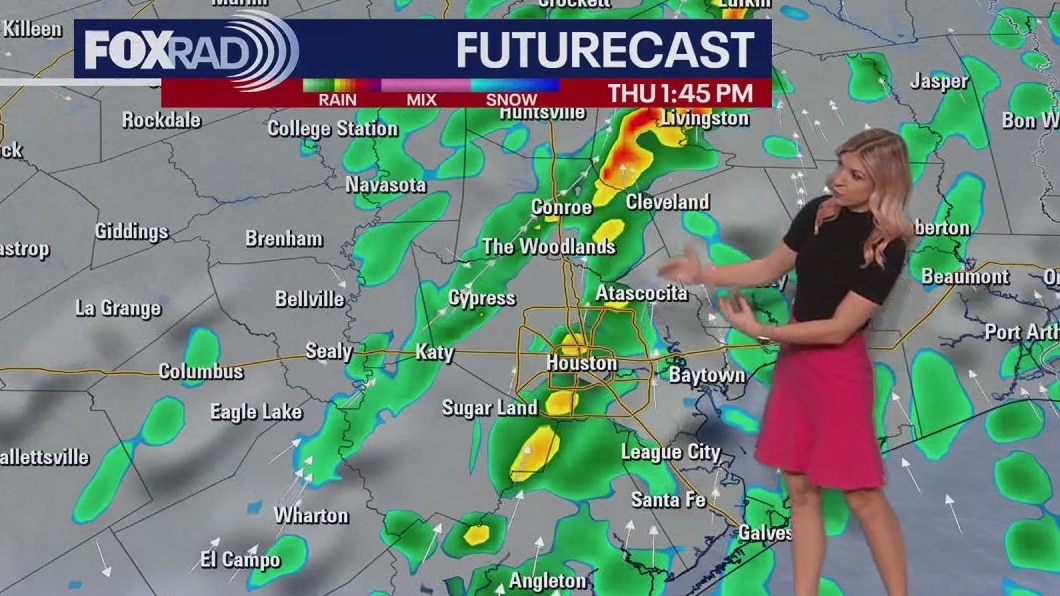 A line of storms will move into the northwestern Houston area late morning and clear off the coast by 7pm.