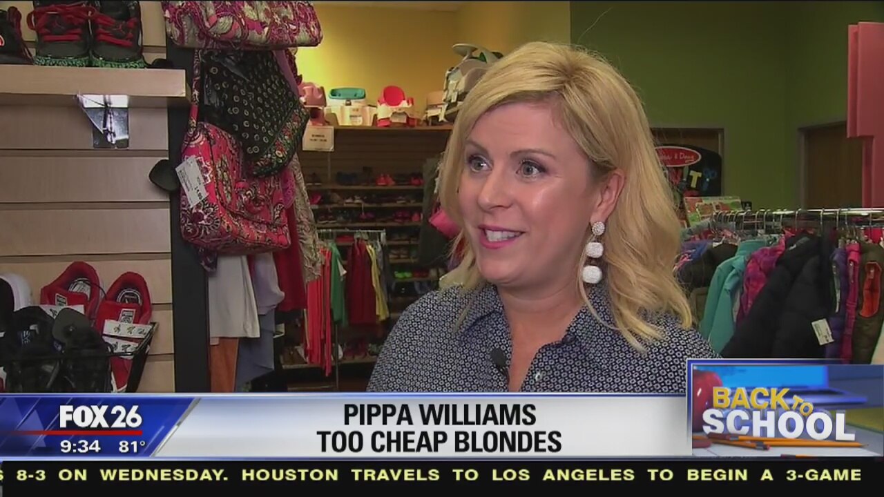 FOX 26 Morning News anchor Sally MacDonald learns about thrift store shopping savings for back-to-school clothes from Pippa Williams and Jen Meneeley with Too Cheap Blondes.