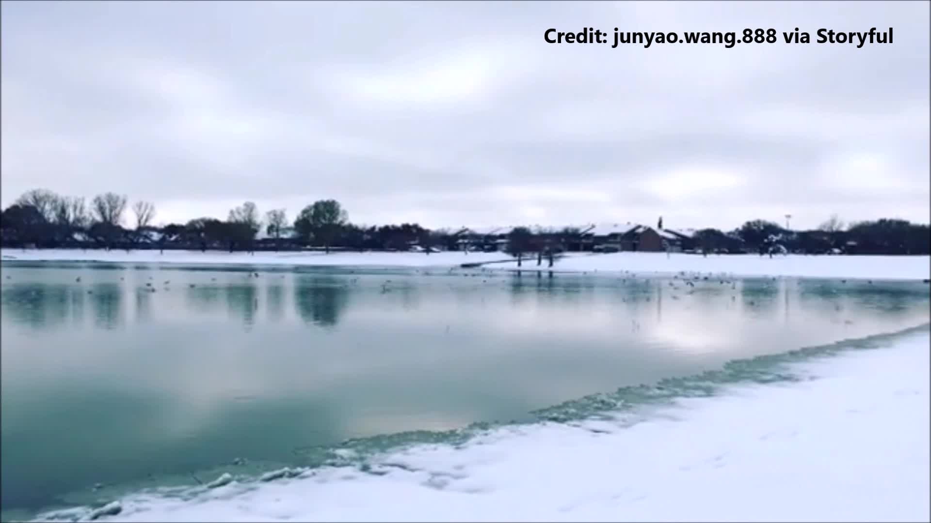 Birds fly across a lake in Lubbock's Leftwich Park after a heavy snowfall during the weekend of December 8. (Credit: junyao.wang.888 via Storyful)