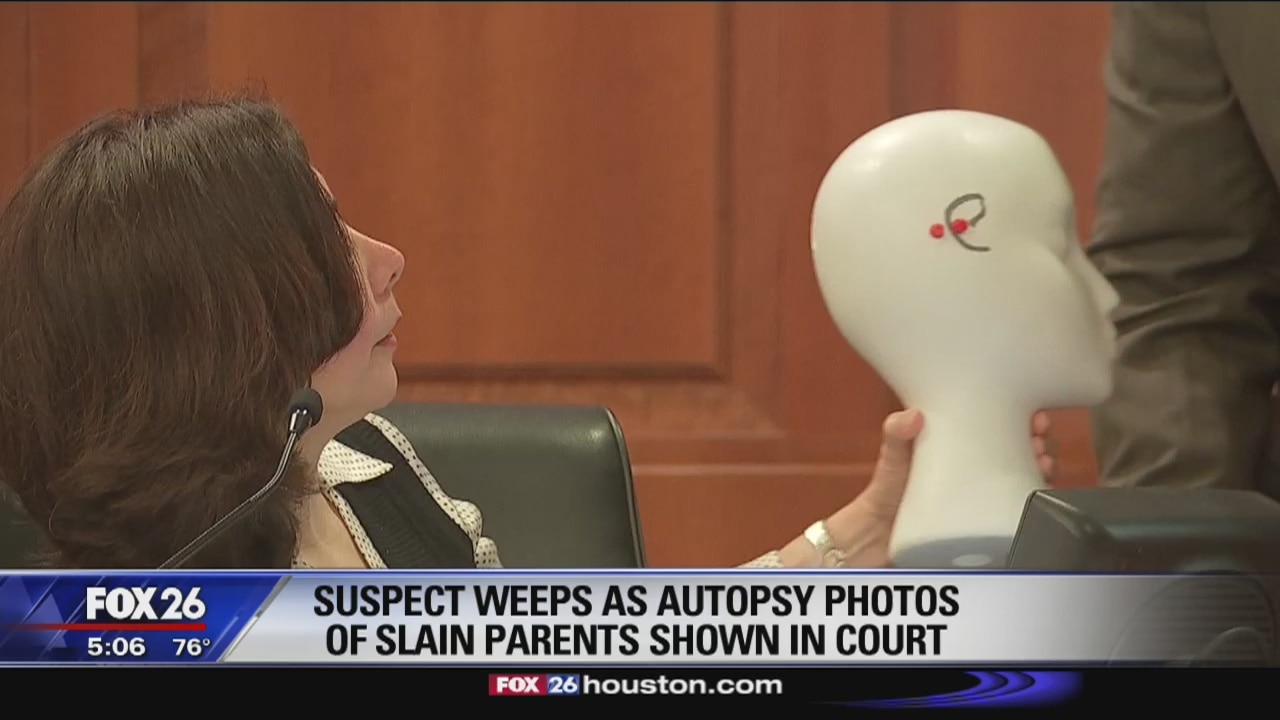 Suspect weeps as autopsy photos of slain parents shown in court