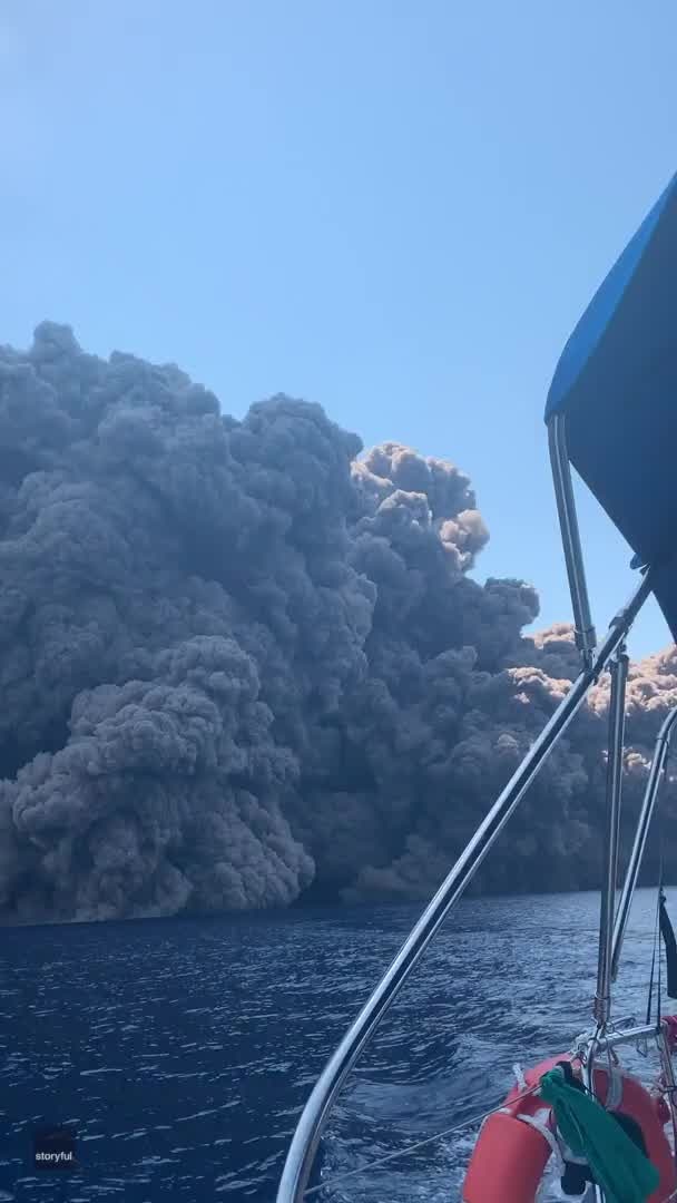 Boaters sailing off Messina, Sicily got a close-up look at Stromboli Island?s volcano erupting yesterday as a plume of smoke begins to chase them down. Credit: Elena Schiera via Storyful