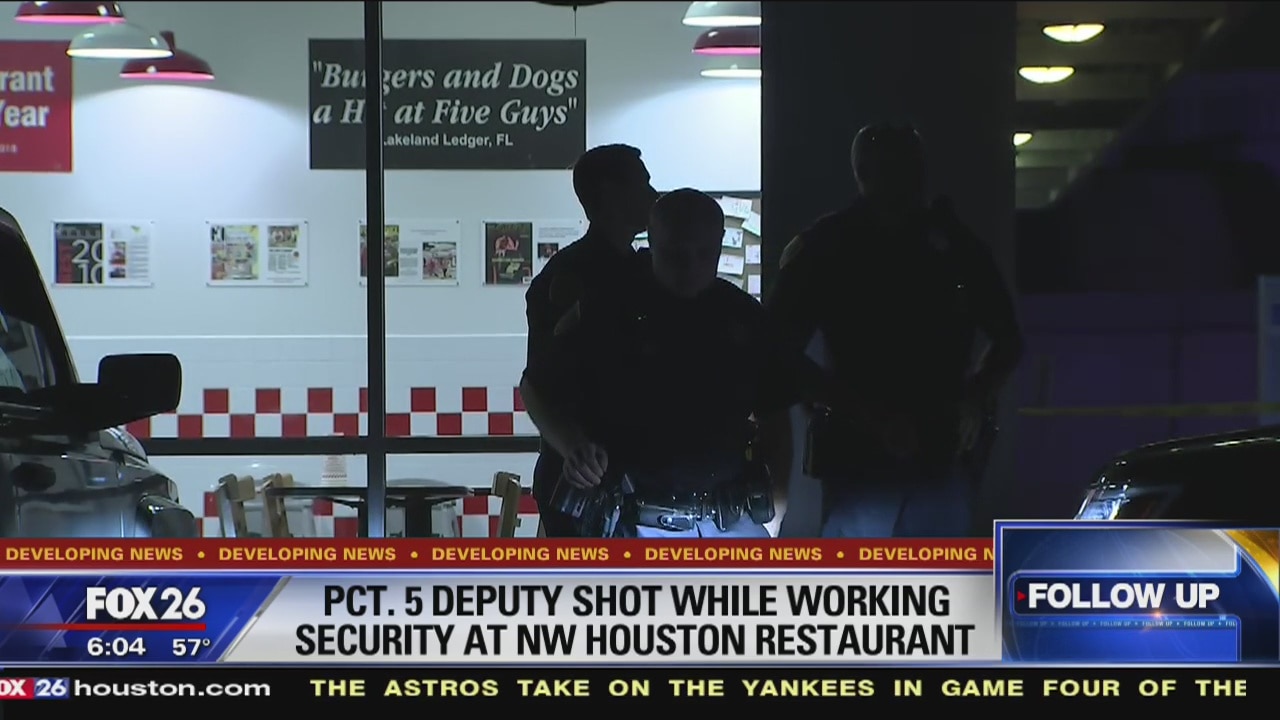A deputy with the Harris County Pct. 5 Constable's Office was shot in the arm while working security at a restaurant in northwest Houston.