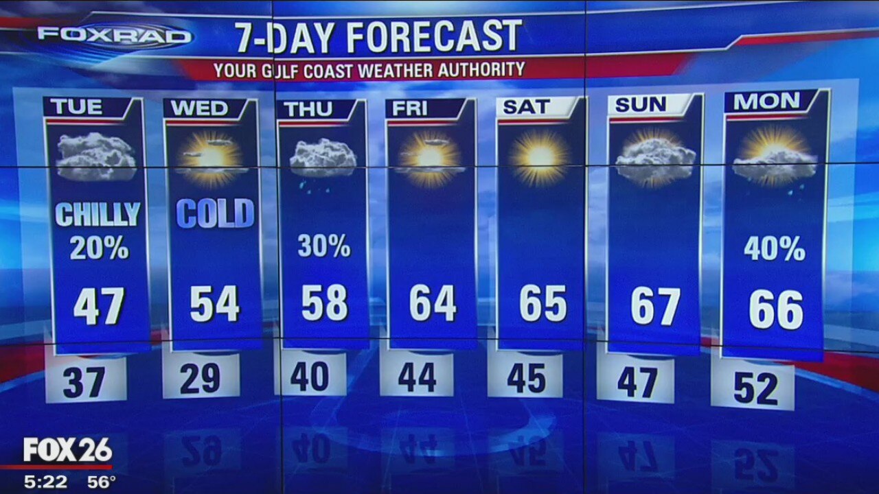 It will be chilly Tuesday with highs only in the 40s and then a light freeze is expected early Wed. morning. The temps will warm a little by the end of the week, but highs will only be in the 60s.