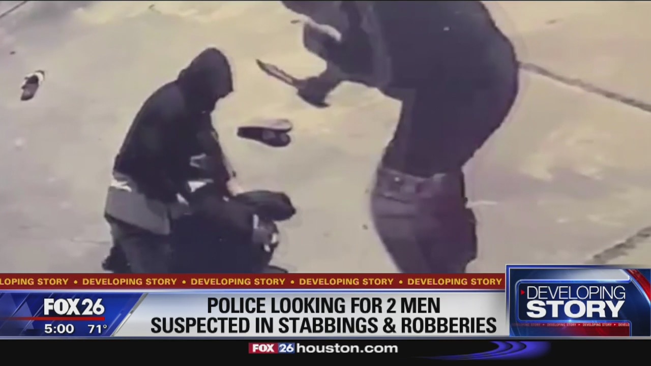 Houston police have released surveillance video of two men they suspect stabbed five people within five hours.