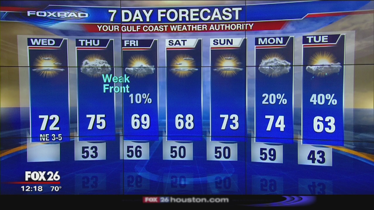 Dry and sunny conditions continue for southeast Texas. Temperatures on Wednesday and Thursday will warm into the low 70s ahead of our next weak front which will push through late Thursday. While we can't rule out a sprinkle on Friday, it's looking like a dry front. The weekend will be seasonable with highs reaching the upper 60s and lows in the low 50s and upper 40s. Next strong cold front will arrive Monday into Tuesday.