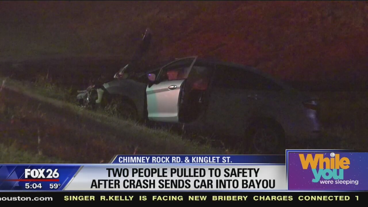 Two people were pulled from a burning car by two other drivers after a crash into a bayou.