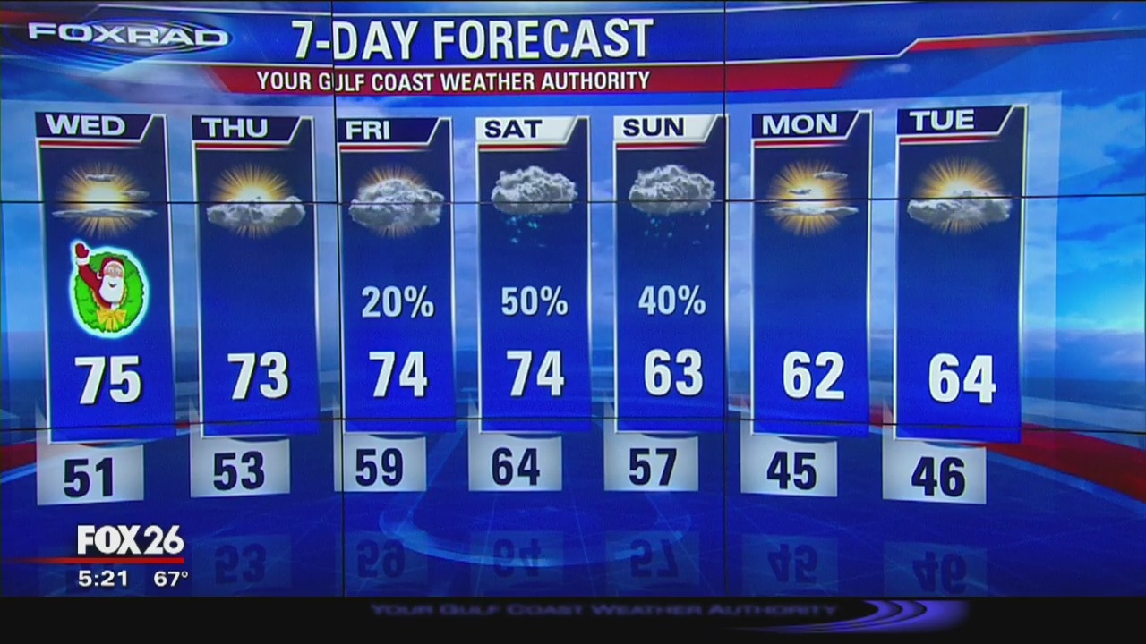 Our unseasonably warm weather will continue into Christmas with temperatures rising, once again, into the low and mid-70s. Our next rain chance arrives late Friday, but a better shot comes on Saturday and Sunday as a cold front sweeps through the area.