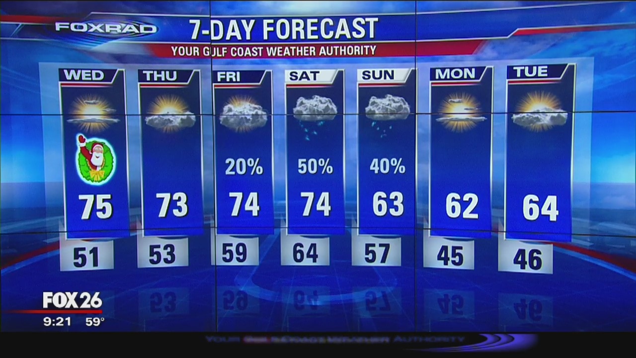 Warm for Christmas Day. Look for more clouds towards the end of the week with a cold front over the weekend bringing us some rain.