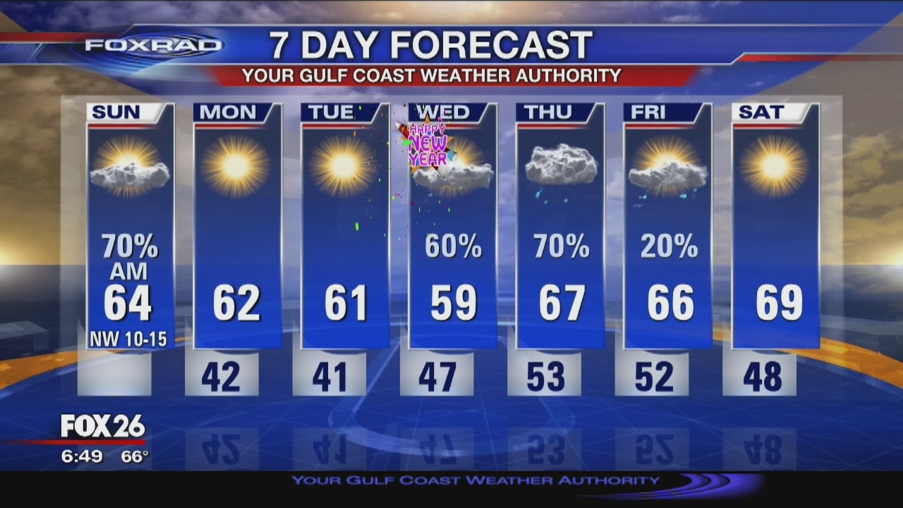 A cold front continues pushing south, toward the Gulf of Mexico with showers and storms ahead of it. This afternoon, skies will clear and temperatures will be much cooler to start the work week. Next rain chance comes on New Year's Day.