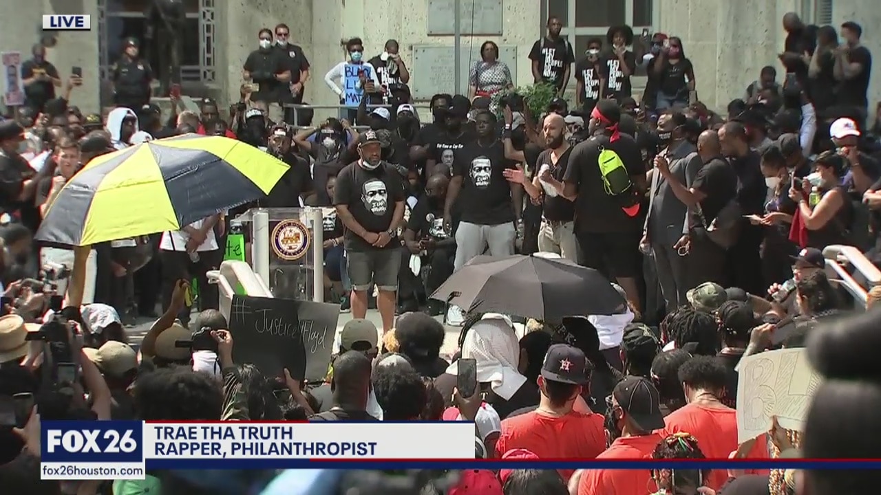Trae tha Truth speaking to the thousands that marched to city hall for George Floyd in Houston .