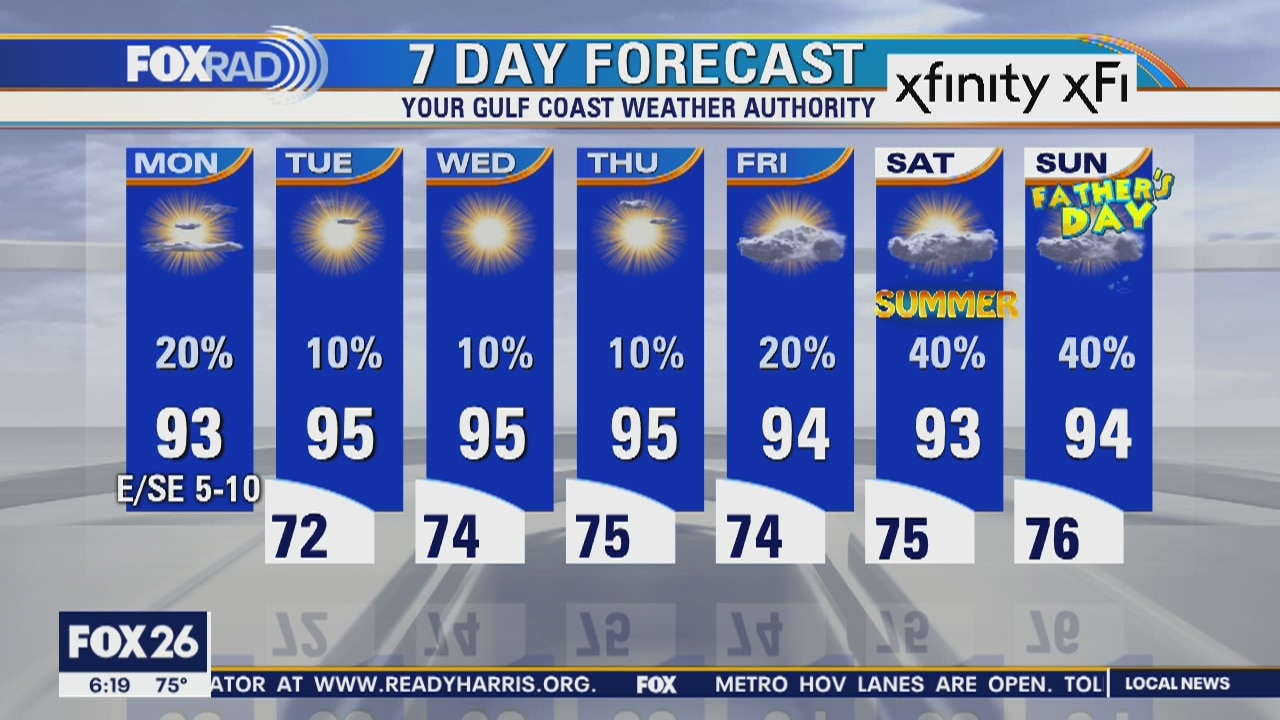 Humidity is back this week and it will result in warmer overnights and afternoons with a heat index near 100. Watch for isolated storms during the afternoons with about a 10-20 percent chance each day until this weekend. Showers look more likely for the Father?s Day weekend which is also the first official weekend of summer.