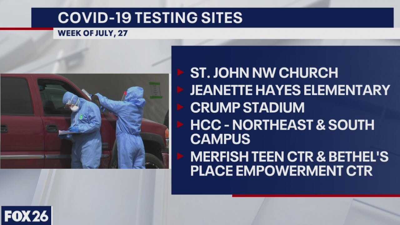 COVID-19 Testing will be available at the following locations this week - St. John- Northwest Church, Jeanette Hayes Elementary, Crump Stadium and HCC Northeast Campus and South Campus These are drive through only sites and do require an appointment . TDEM will also operate 2 walk-up sites with not appointment required at the Merfish Teen Center and Bethel's Place Empowerment Center.