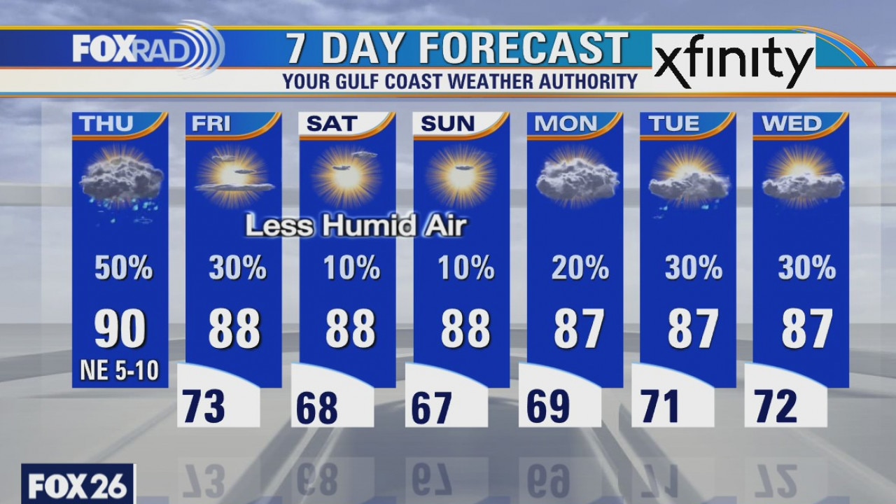 Tropical depression Sally will soak the Carolinas today after dropping more than 25? of rain in Florida. Our high yesterday reached 96, but today?s scattered showers and storms should hold our highs closer to 90. Look for a gradual arrival of drier air tomorrow and this weekend with lows in the 60s. A weak tropical low is likely to form well to our south, so we?ll watch that over the next several days.