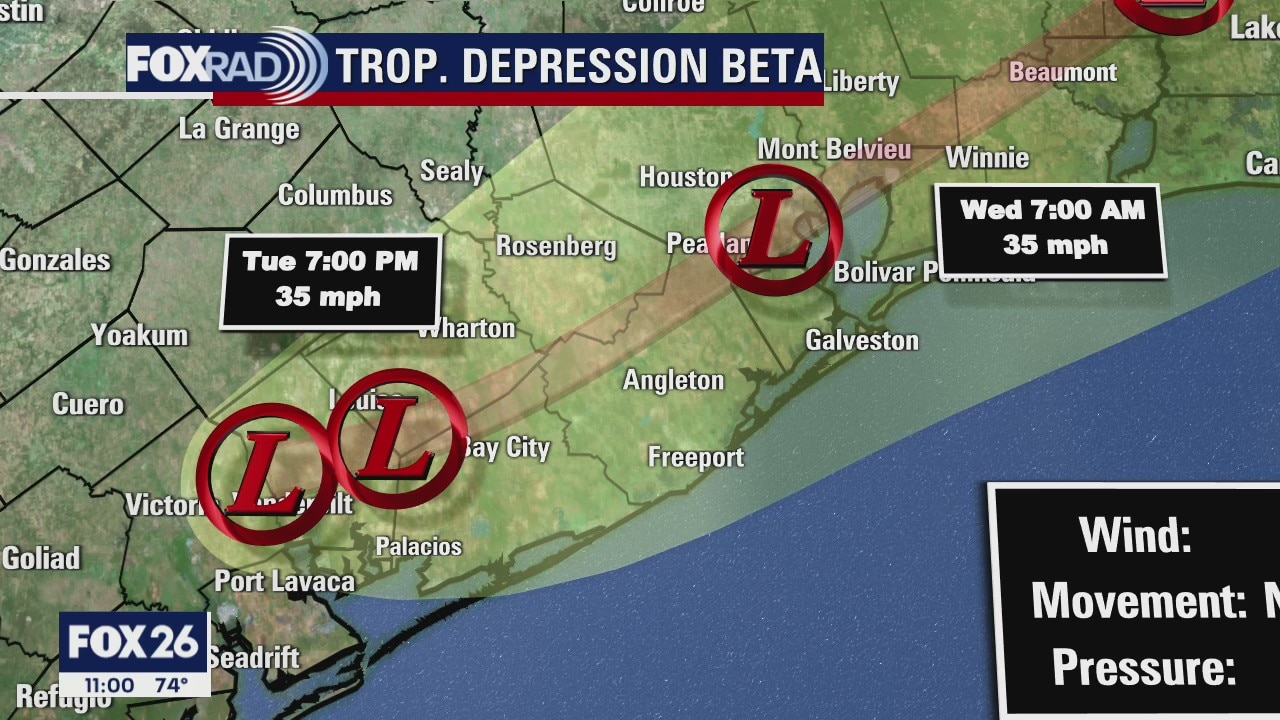 As of the latest advisory, Beta has been downgraded to a tropical depression with winds now at 35 mph. The movement is now toward the northeast at 2 mph. As Beta has now turned, it will slowly ride along the Texas coastline, likely staying inland as the rain bands associated with Beta continue to bring heavy rain over parts of Texas. The center of Beta is forecast to be over or near Houston by Wednesday morning before lifting out of the area later that afternoon.