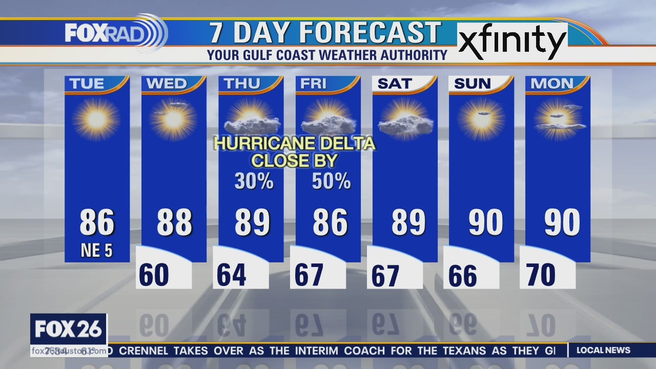 As we watch Hurricane Delta gain strength in the Caribbean, our weather looks great today and Wednesday with lots of sunshine and highs in the mid to upper 80s. By Thursday, a breeze should kick in as Delta gets closer to the Texas coast. On Friday, Delta is expected to pass to our east as a significant hurricane. Although we?ll most likely avoid a direct impact, some coastal flooding and large waves should be expected.