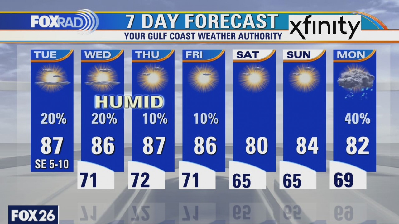 A pattern of above normal warmth will stay with us through Friday. Look for only isolated showers with highs in the mid to upper 80s. Patchy morning fog is possible. A brief cold front will move through early Saturday, then a much stronger front is on pace for Tuesday next week. Lows could drop into the 40s following the front.