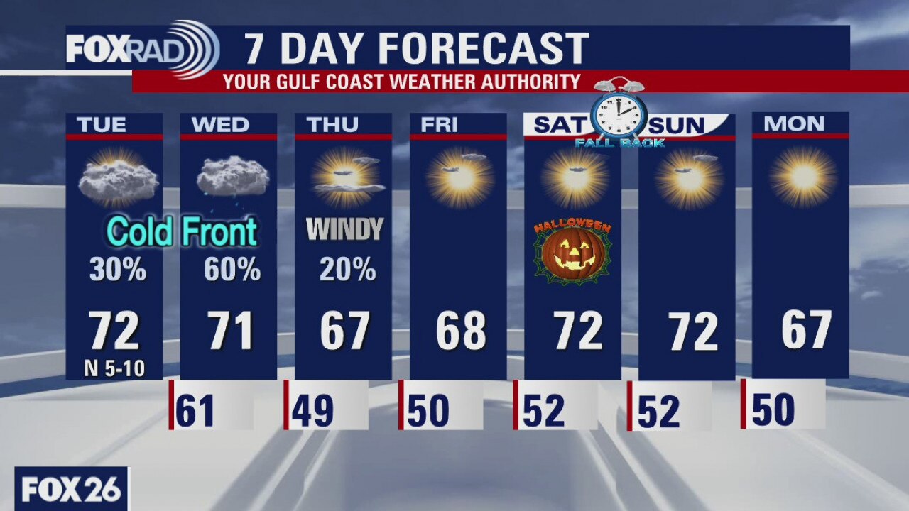 Today is an unusual one with chilly air west of Houston and muggy air along the coast, so with highs in the low 70s in Houston, expect 50s and 60s out west. A front will sweep through here tomorrow bringing cooler air and eventual clearing. Thursday through this week will be clear and chilly with lows in the 40s and 50s and highs near 70. Hurricane Zeta will pass well east of our area late Wednesday with the only effect here being waves and minor coastal flooding tomorrow.