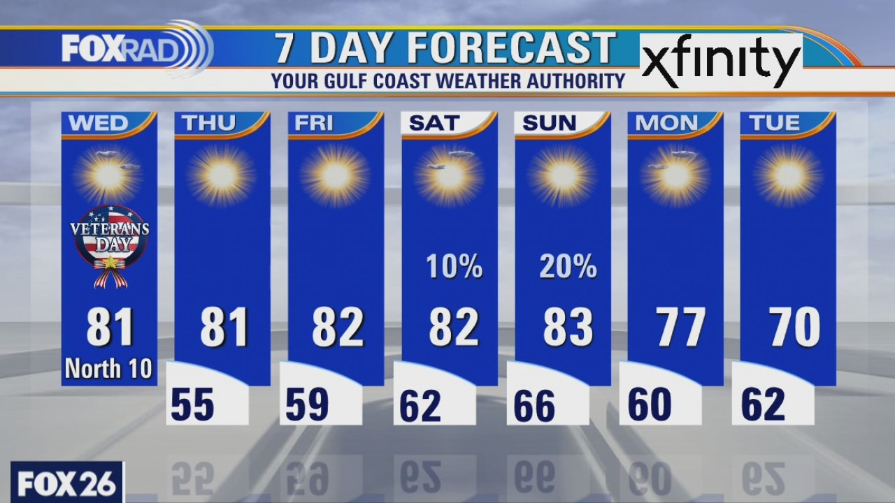 As hurricane Eta lashes the eastern Gulf, our side is looking tranquil for this Veterans Day. Look for sunshine with less humidity and pleasant highs in the low 80s. Thursday and Friday should be very nice as well with morning temperatures in the 50s. Some moisture returns this weekend before our next cold front early next week.