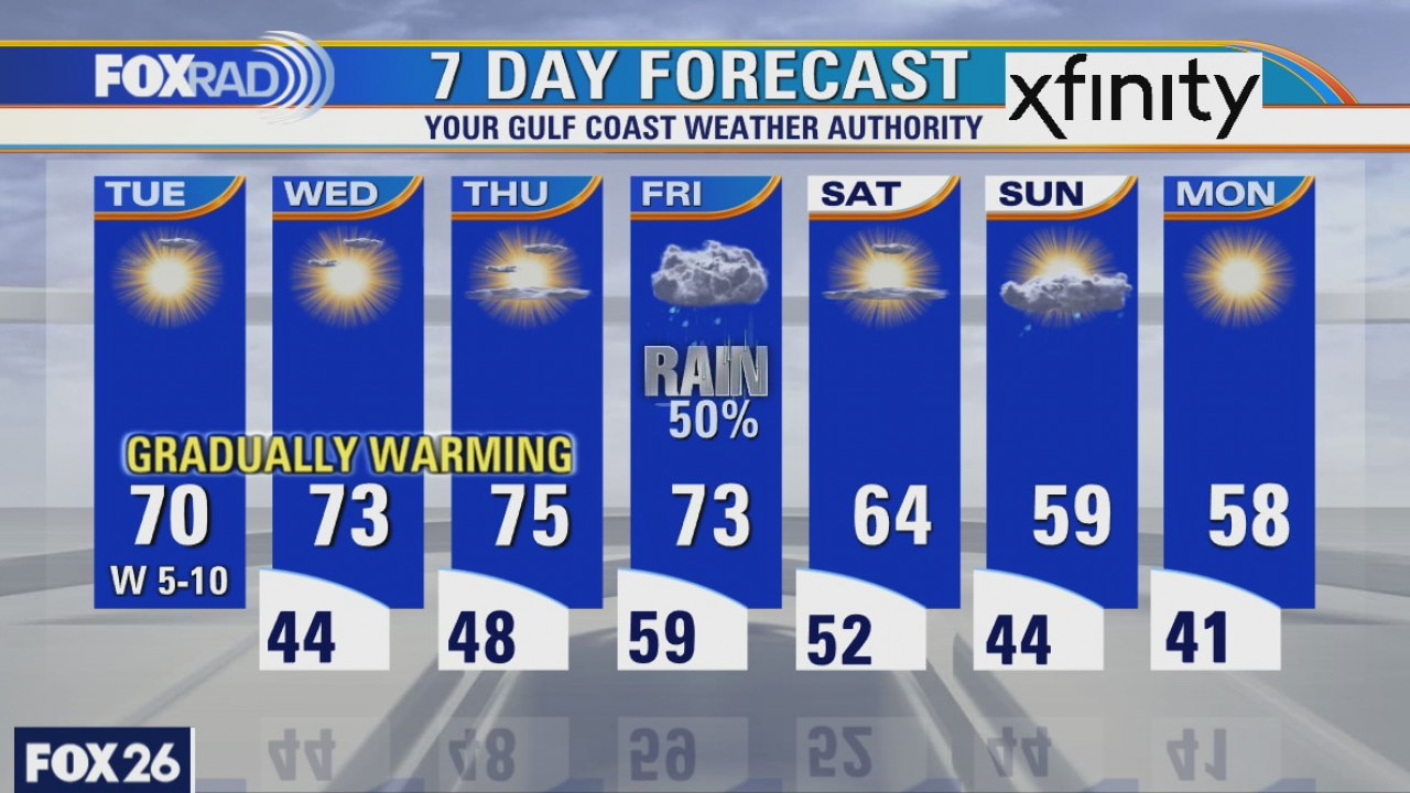 Look for more sunshine across the Houston area the next few days. Temperatures gradually warm as we work our way through the week. Mornings will be cool, afternoons will see temps in the 70s. Next rain chances arrive Friday when a cold front will push through the area but most of the weekend looks to see more sunshine.