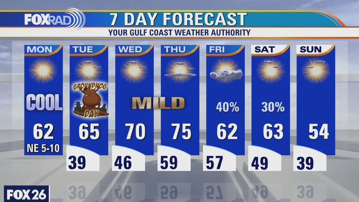 After a chilly morning, we're looking at a sunny, cool and dry day - pretty nice. Tomorrow is looking good, too (Happy Groundhog Day Eve). Milder air returns from the Gulf by Wednesday and Thursday, so we'll warm up before our next front on Friday.