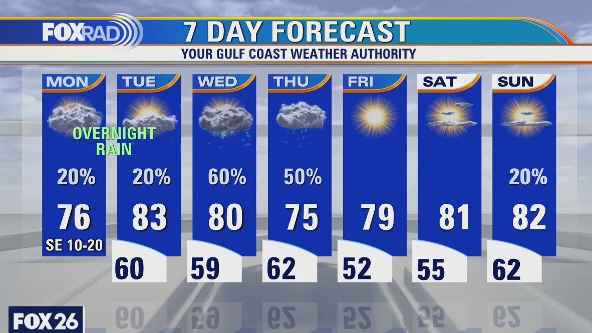 Look for a breezy and mild start to the week with just a few showers through the day today. Overnight tonight, storms are likely as a quick-moving disturbance moves overhead. Rain should end by Tuesday morning with another round of showers expected Wednesday through early Thursday. Overall, temperatures this week will be above normal for this time of the year.